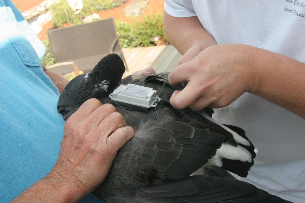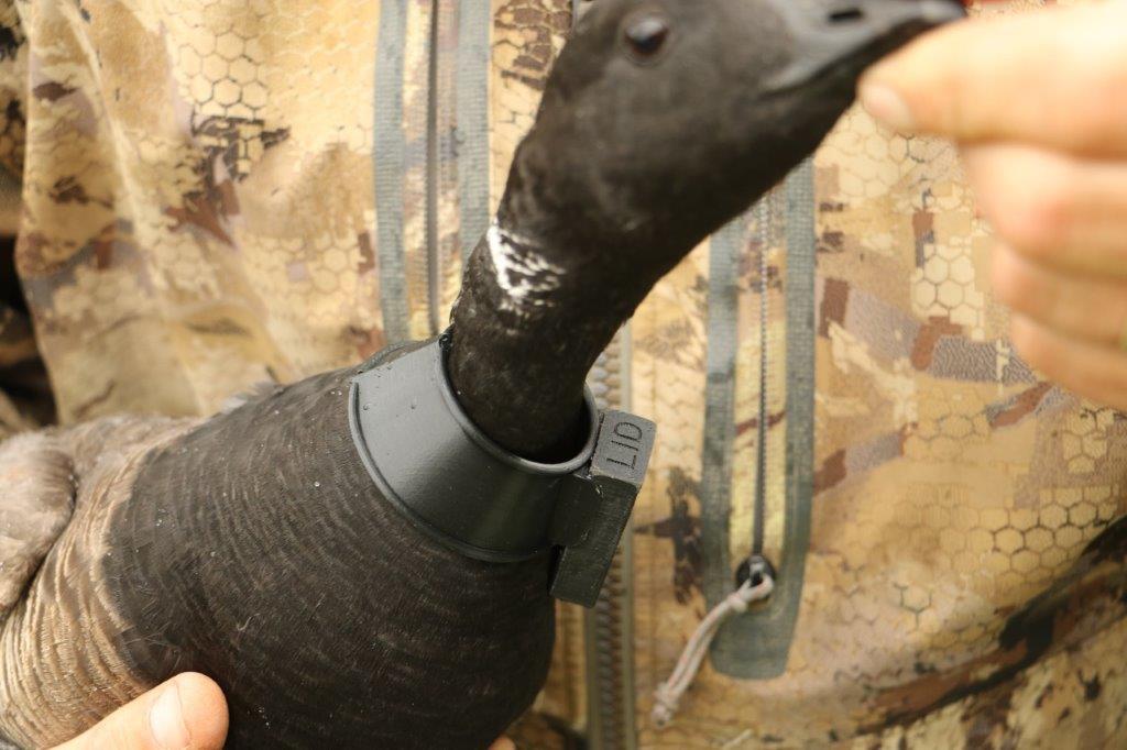 Brant have a very rigorous and fascinating annual migration that has been the subject of much study. Decades of traditional leg banding tells some of the basic story but telemetry has revealed many more of the exciting details. Early work involved surgical implants of satellite transmitters that provided unprecedented exact locations of birds anywhere in real time. Drawbacks included the expense of satellite usage and battery size needed to extend transmitter life to record annual cycles. This has lead to development of back pack style devices using solar panels for battery charging. These units record and store location data until it can be downloaded to a cell tower or other receiving station. Another design being tested here no involved attaching data recorders to neck collars WBF has assisted with harness design and attachment technique using our captive Brant flock. . Another design being tested here now is data recorders attached to neck collars as used on larger geese and swans. USGS, USF&W, and WDFW personnel have all enjoyed having live test subjects readily available.
