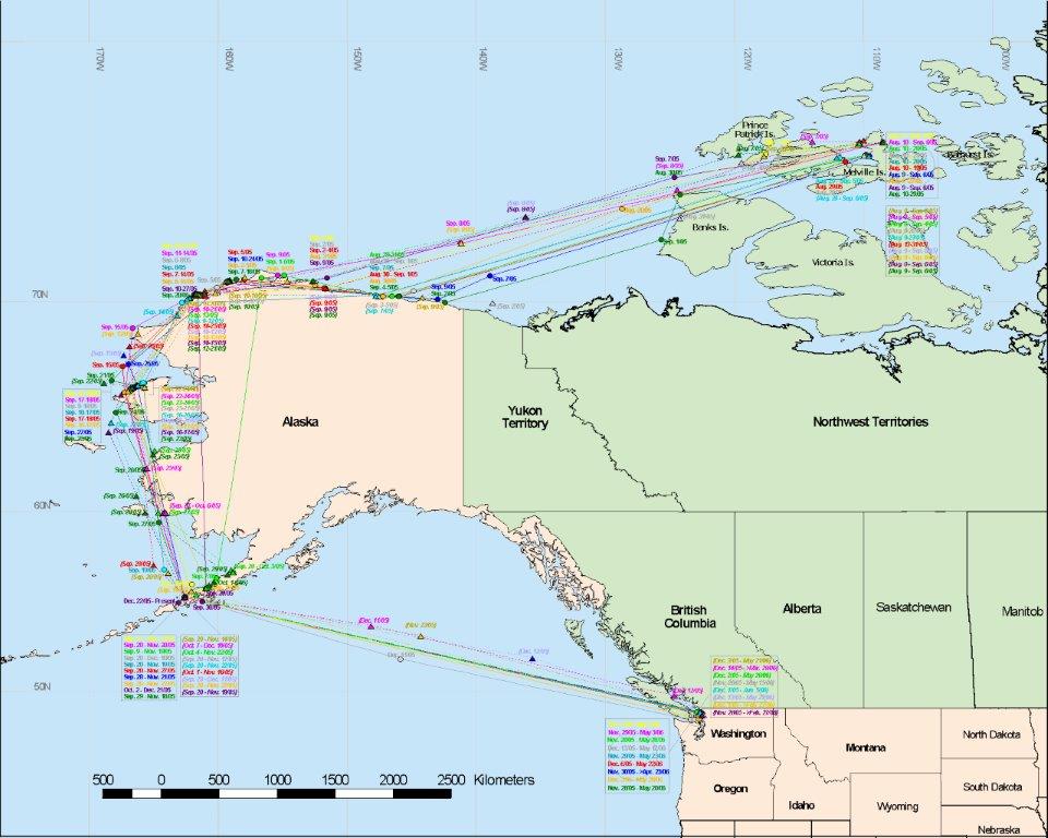 One amazing discovery came about in the spring of 2006 during northbound migration of Western High Arctic Brant. Telemetry documented for the first time ever some birds take an inland shortcut through the NW Territories of Canada enroute to nesting grounds in the Parry Islands. This is highly unusual behavior for any Pacific Flyway Brant as they are rarely seen more than a short distance away from the coastline. Refer to tracking map.